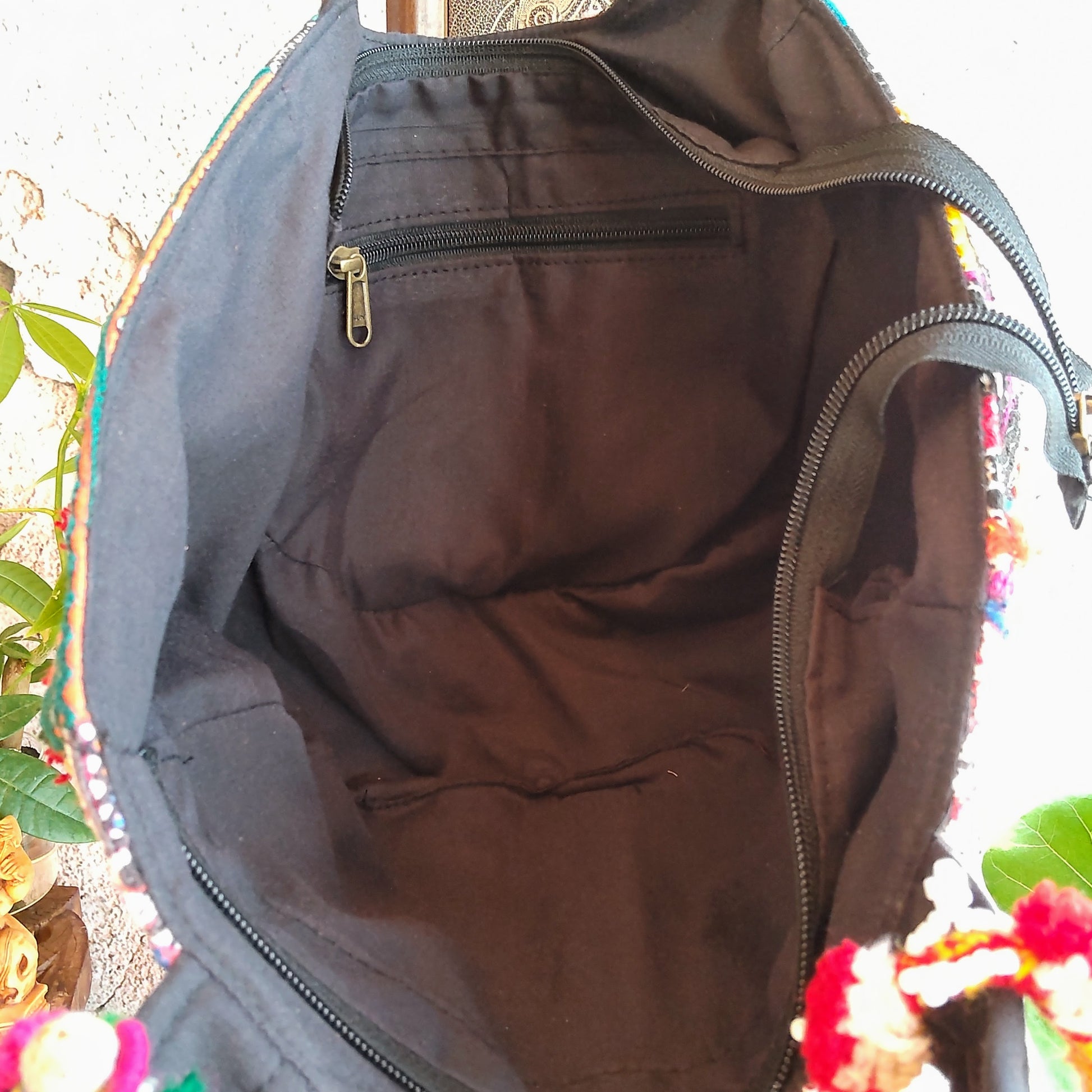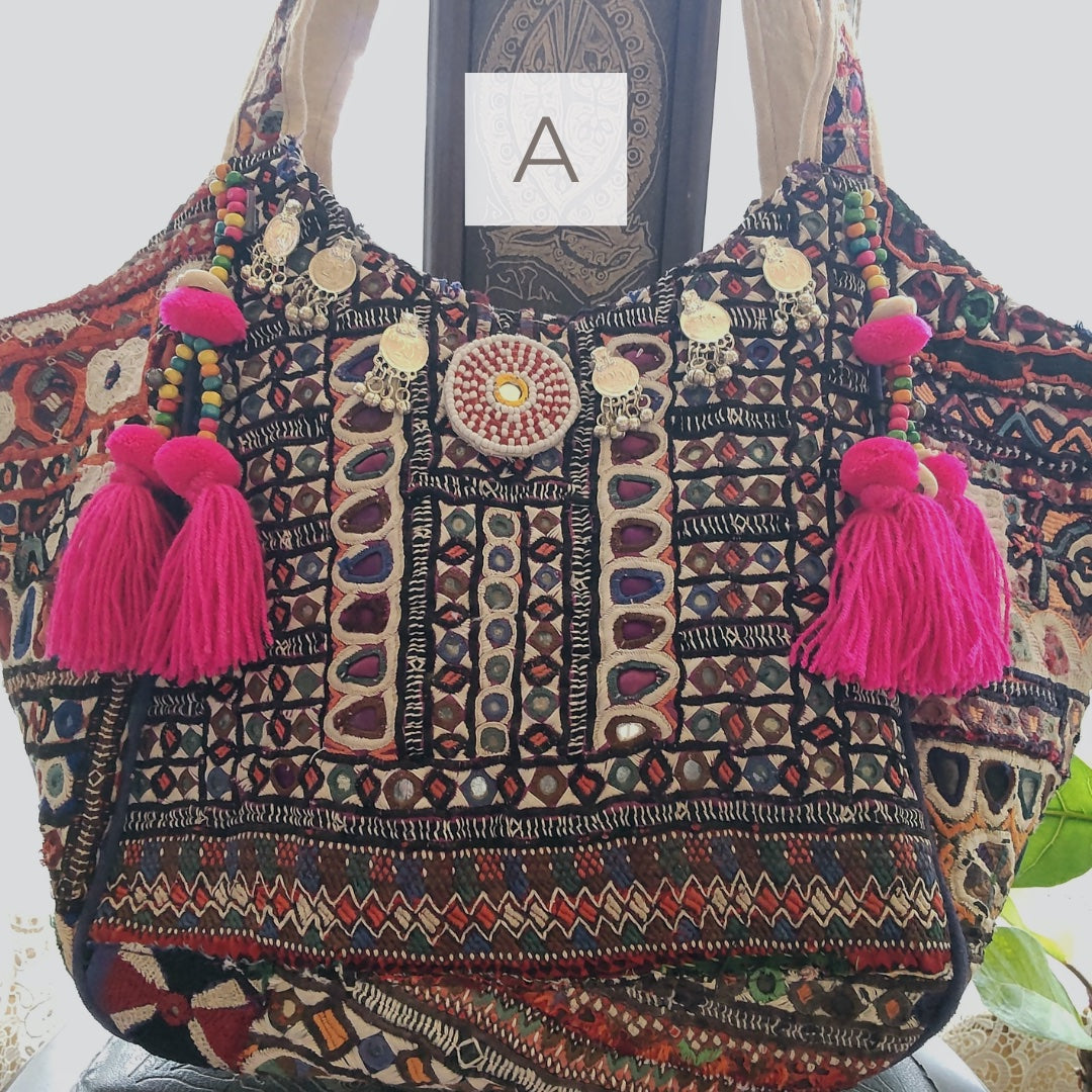 選んで頂いた生地はトートバッグはどちらかの面の中央の大きな部分に、フタ付きショルダーはフタの部分に、巾着ショルダーは表面側に使われます。その他の部分は店主の信頼するセンスの良い、インドの職人さんにお任せ下さい。