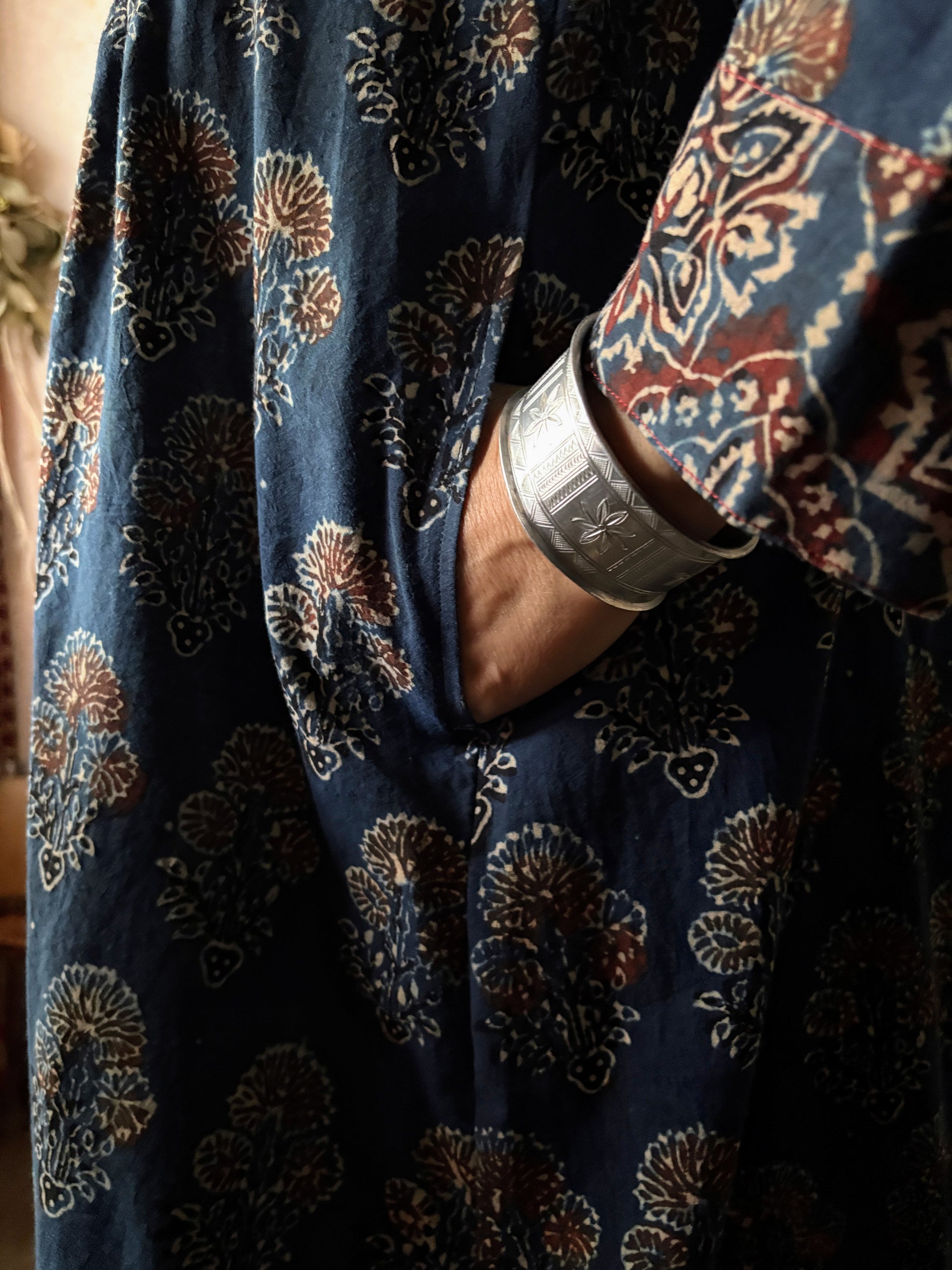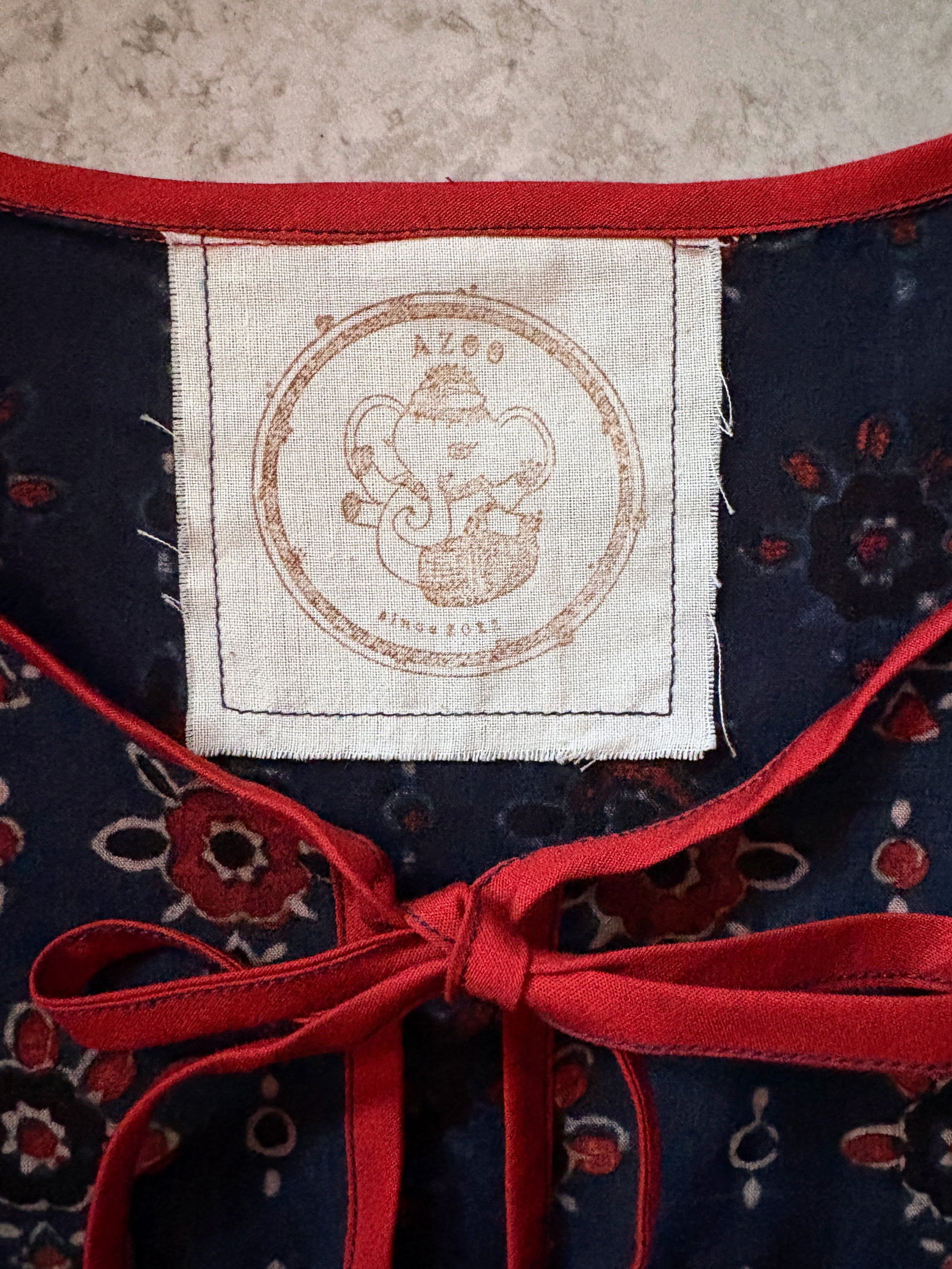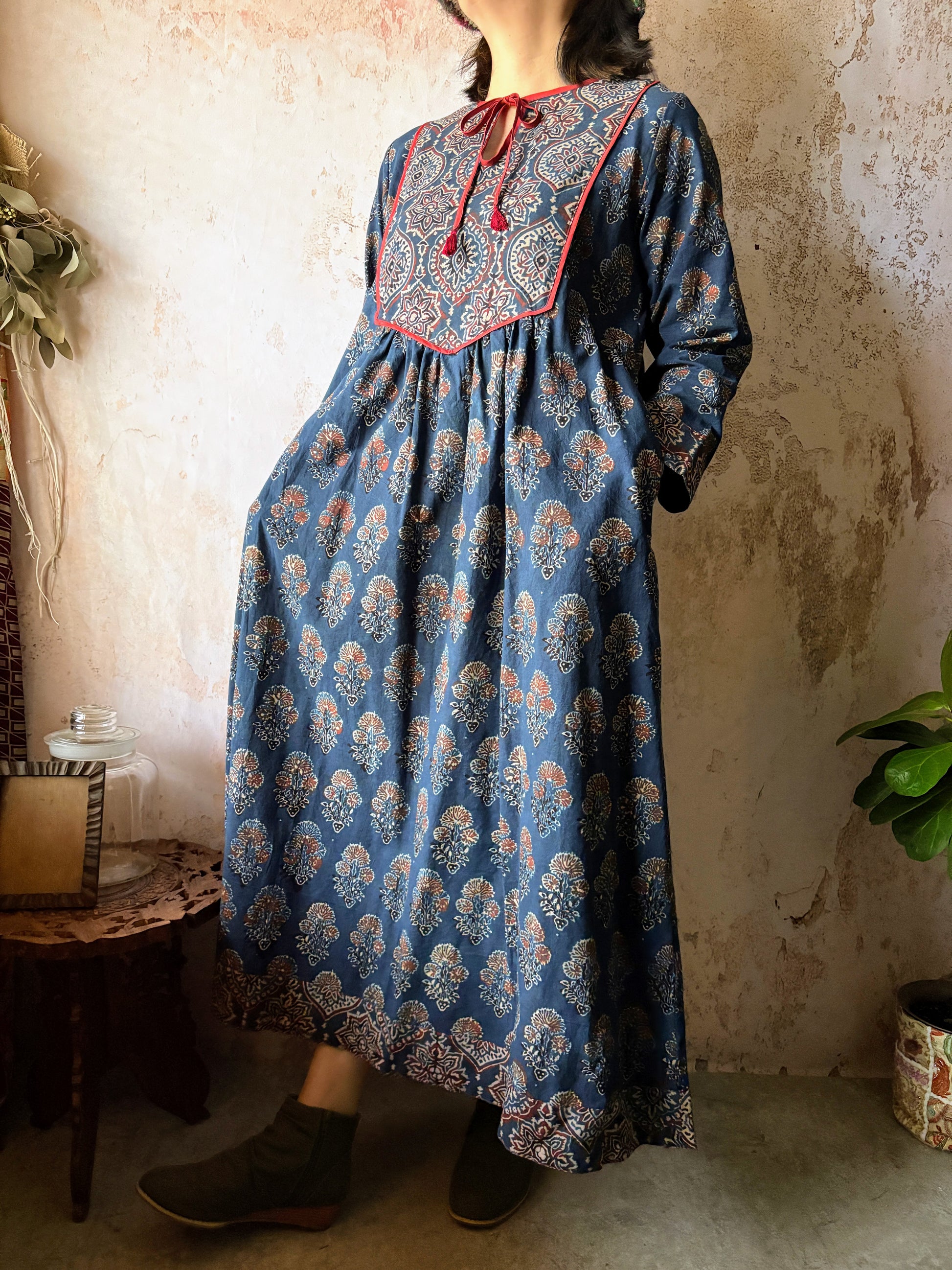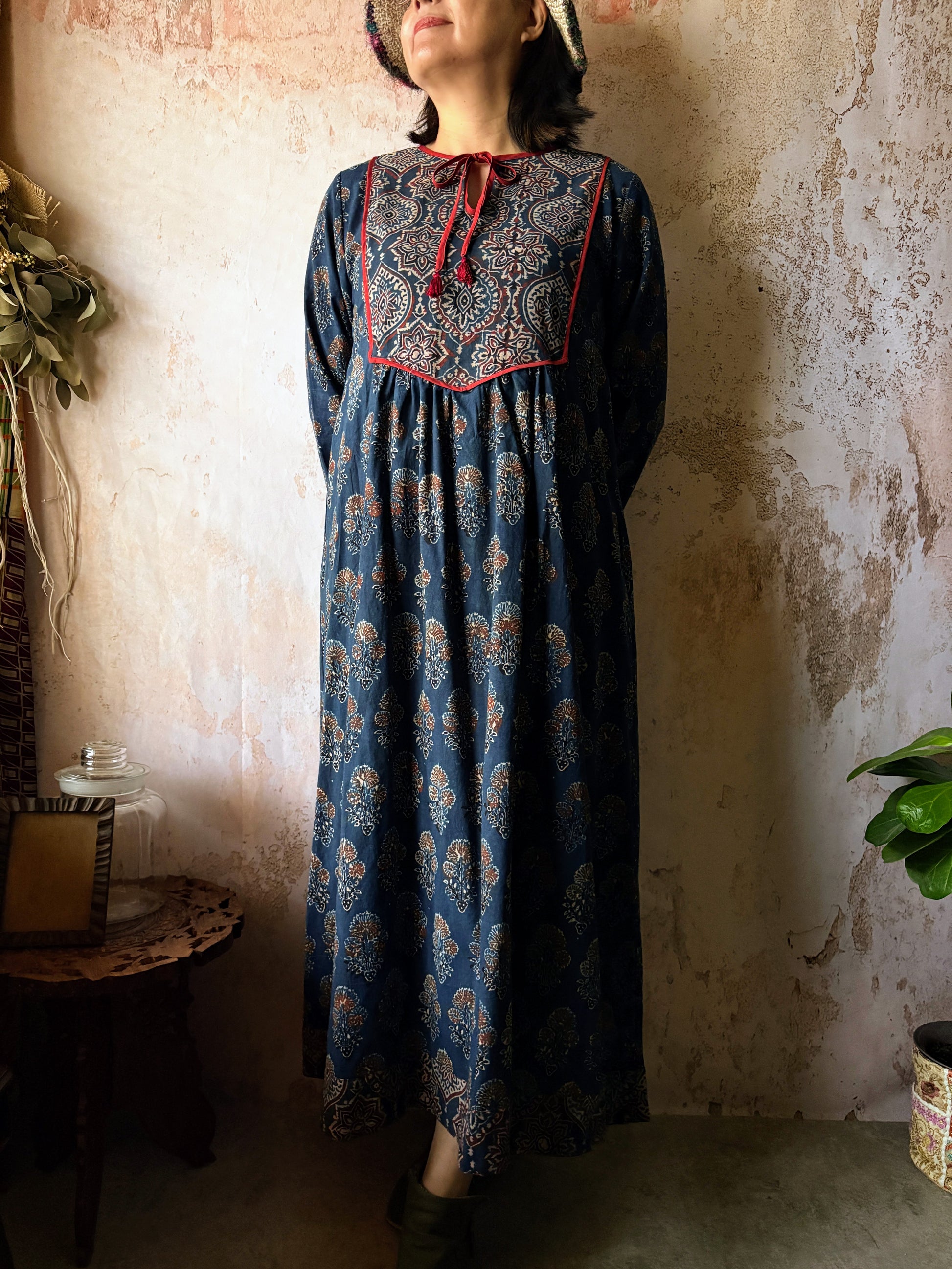 同じ藍でも印象の異なる2枚の布が一つのワンピースの中で