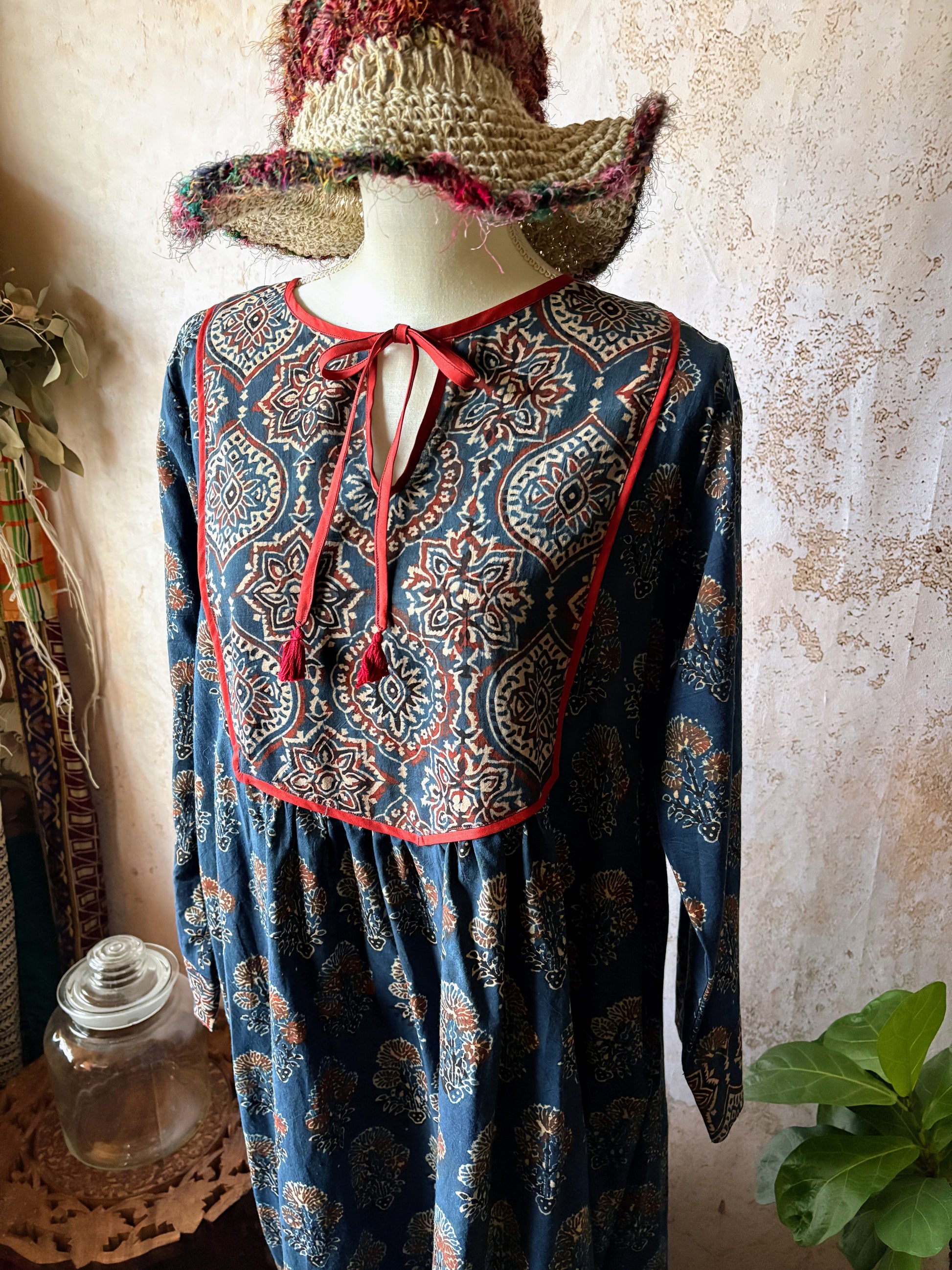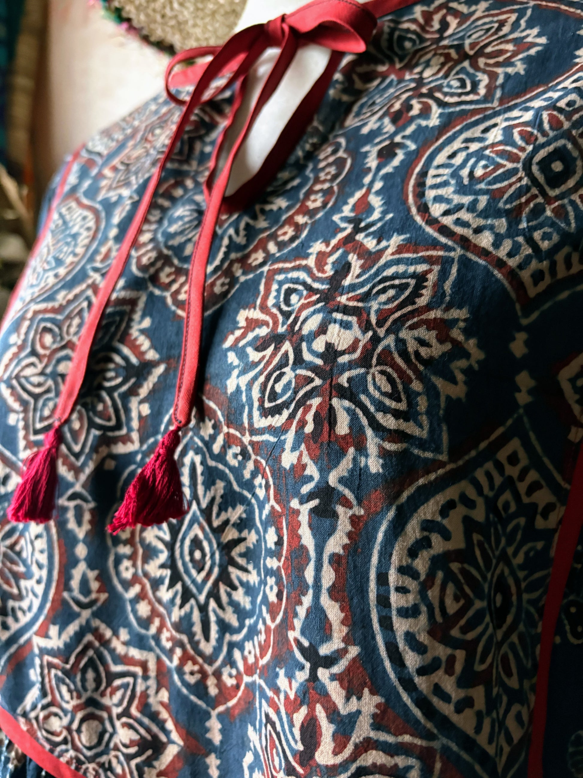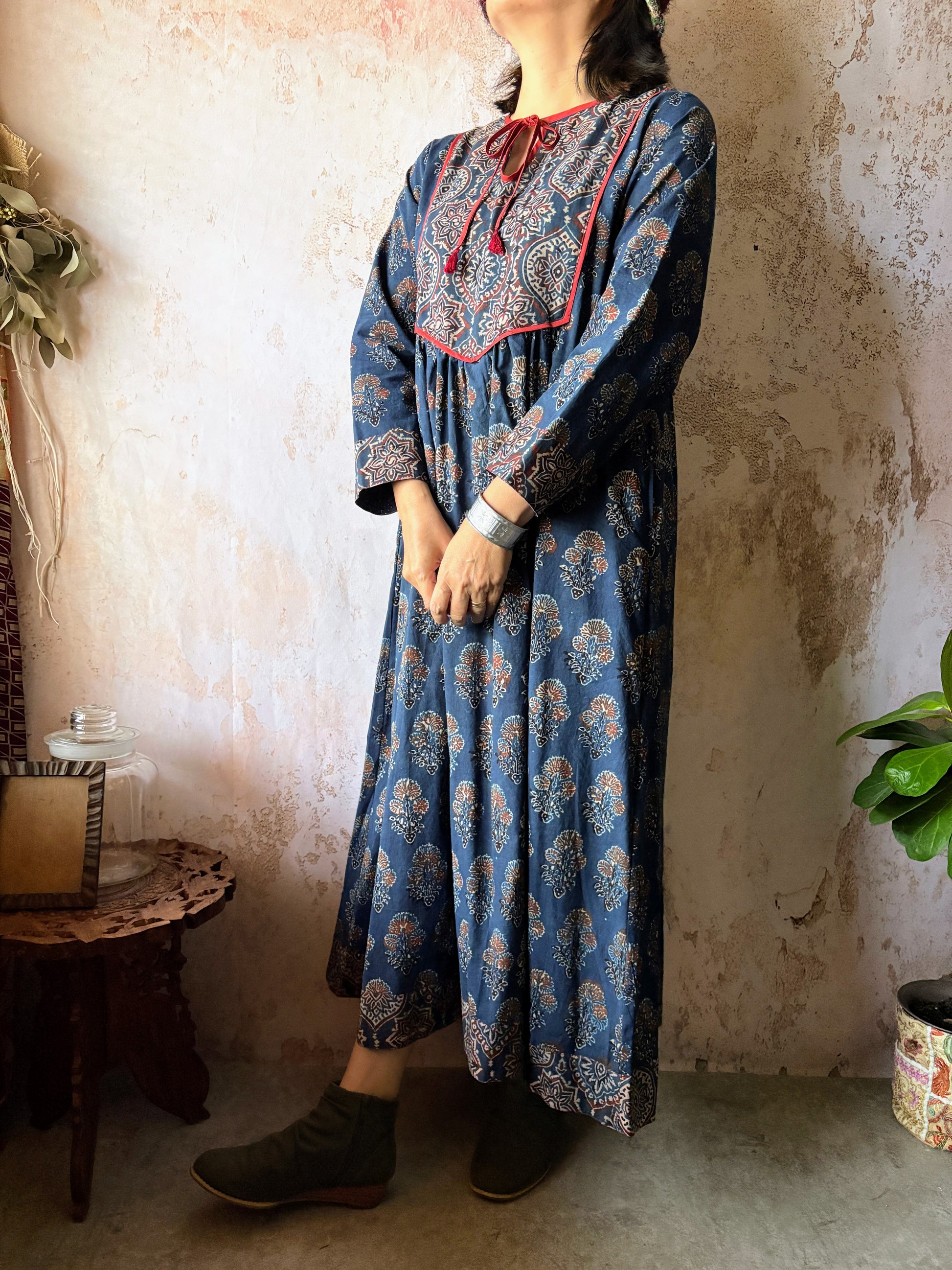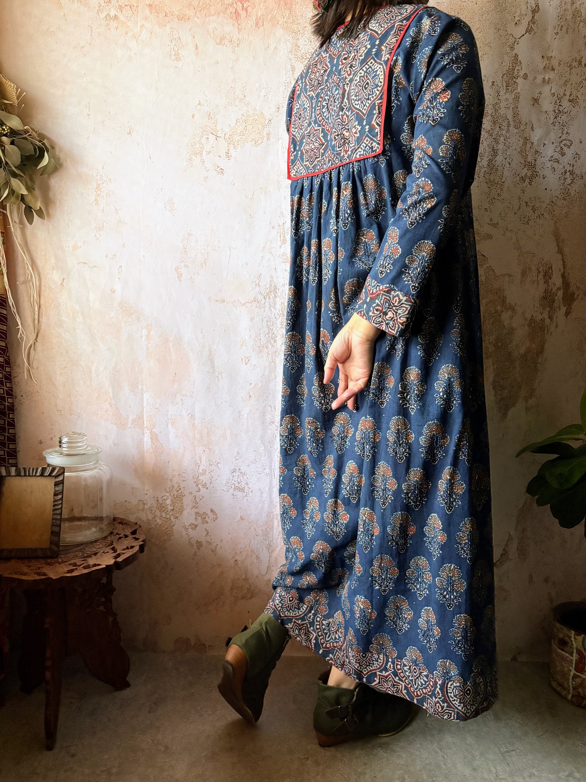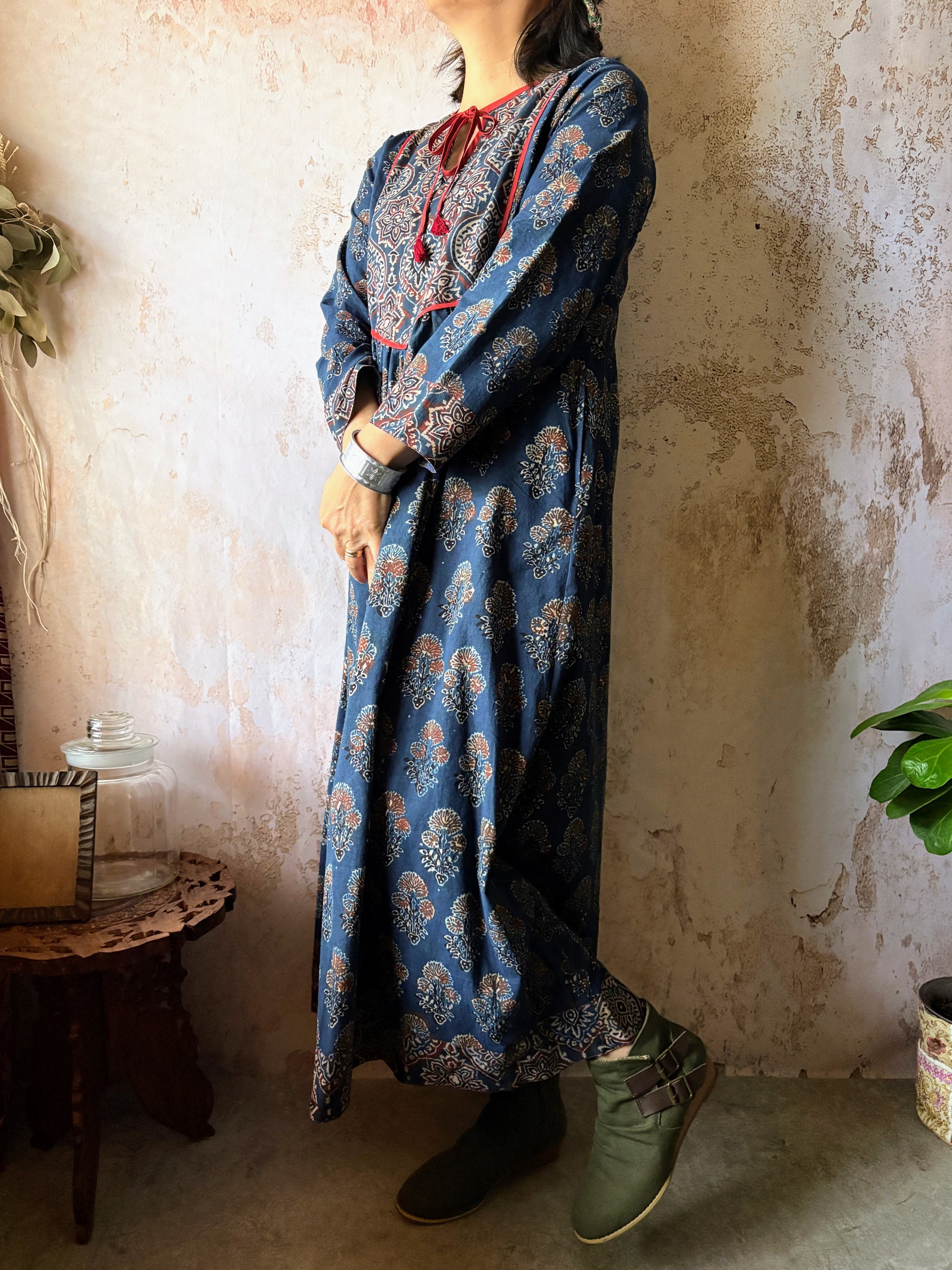 同じ藍でも印象の異なる2枚の布が一つのワンピースの中で