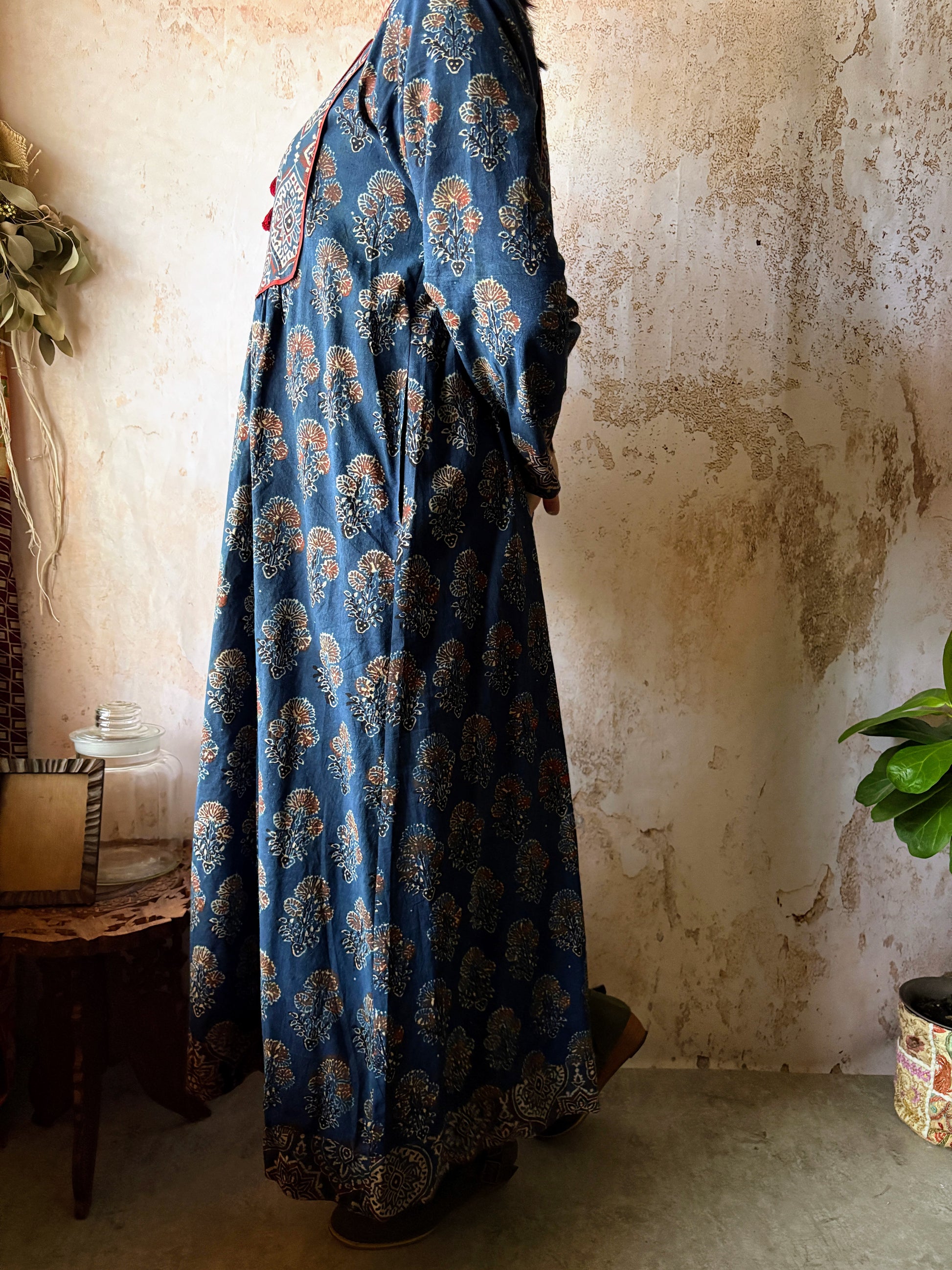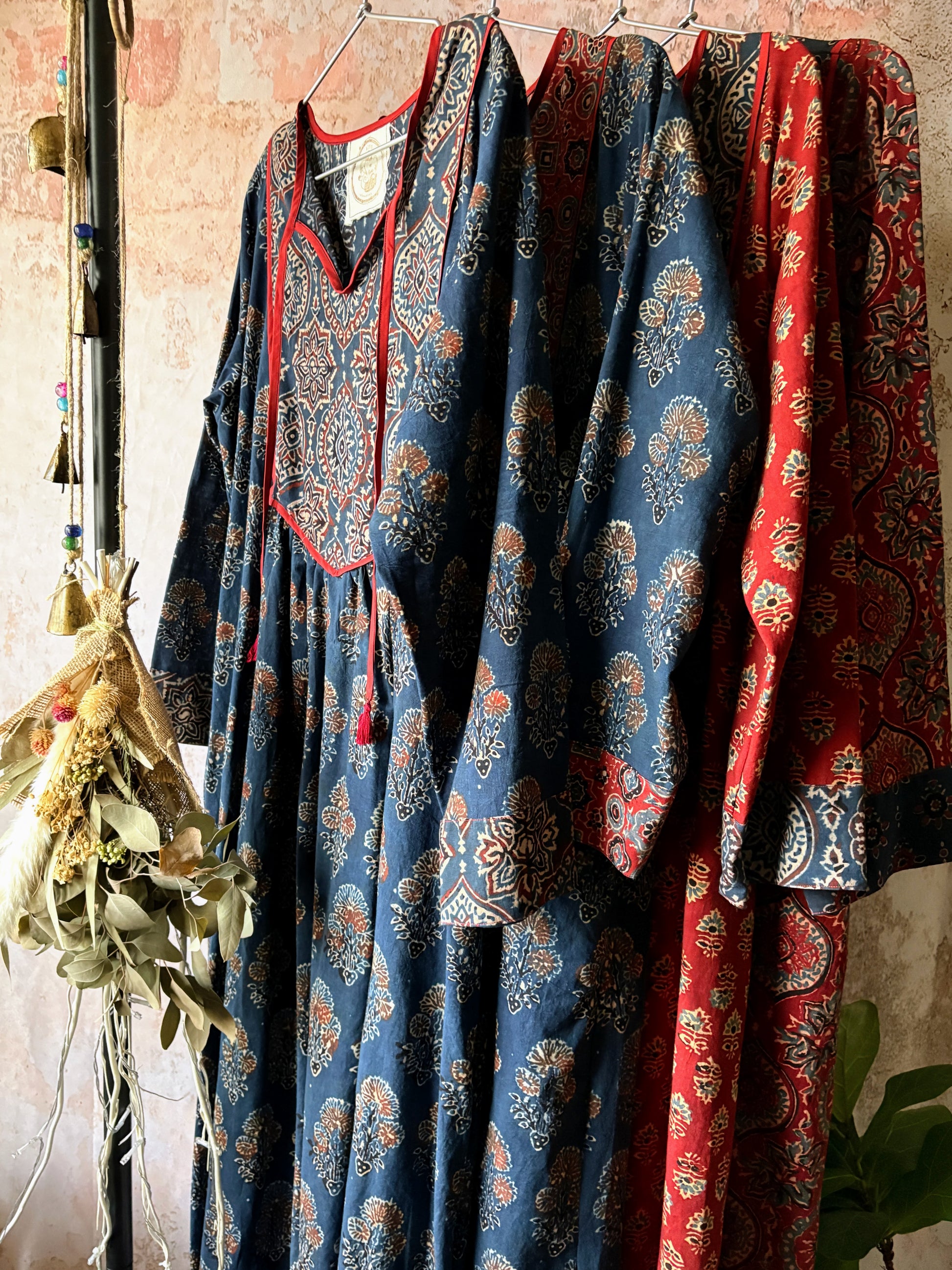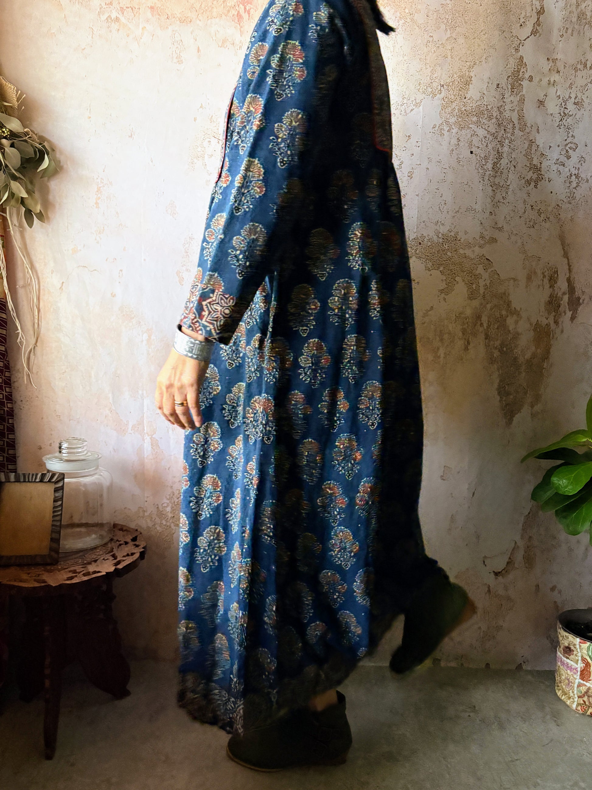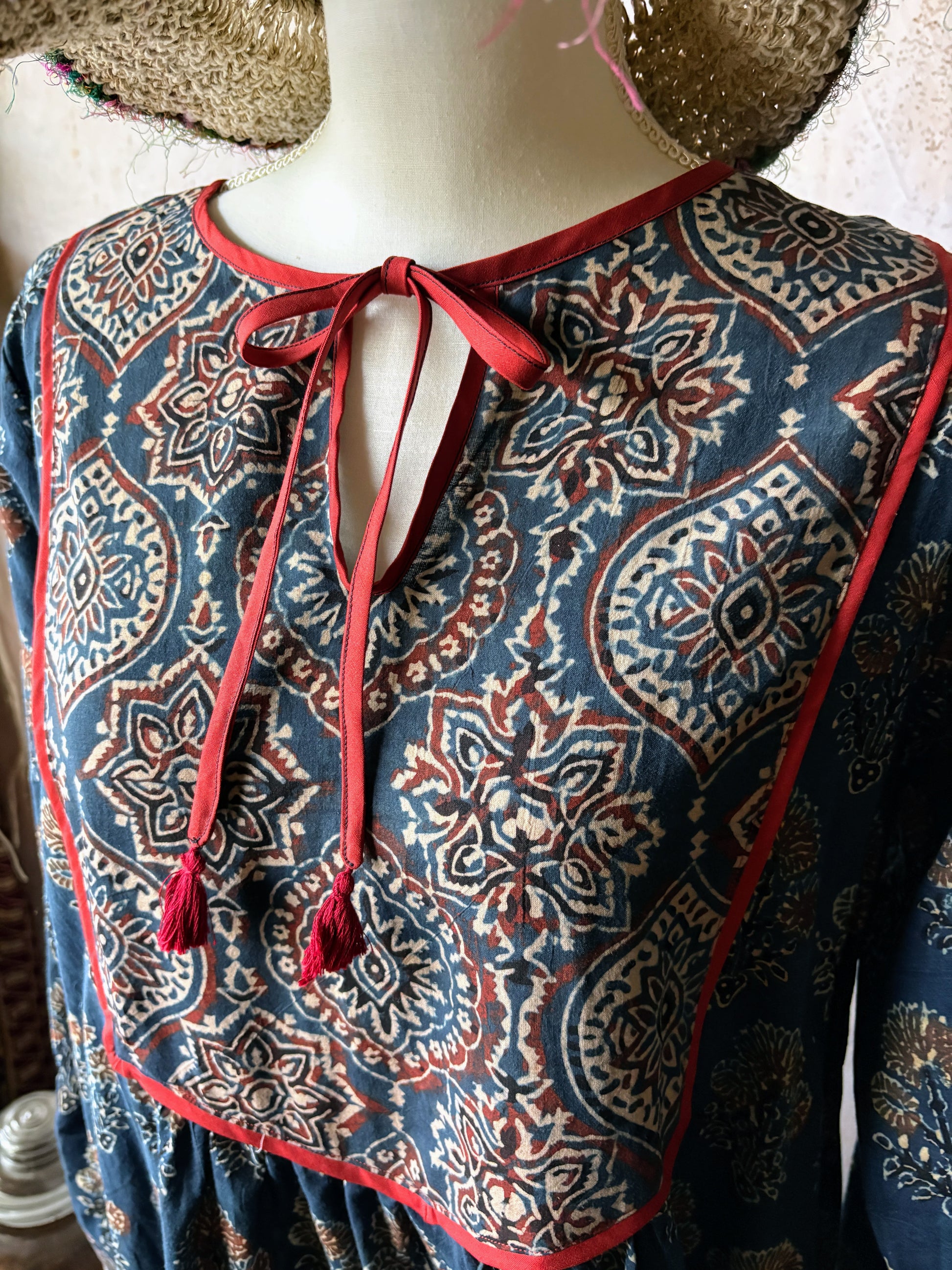 同じ藍でも印象の異なる2枚の布が一つのワンピースの中で