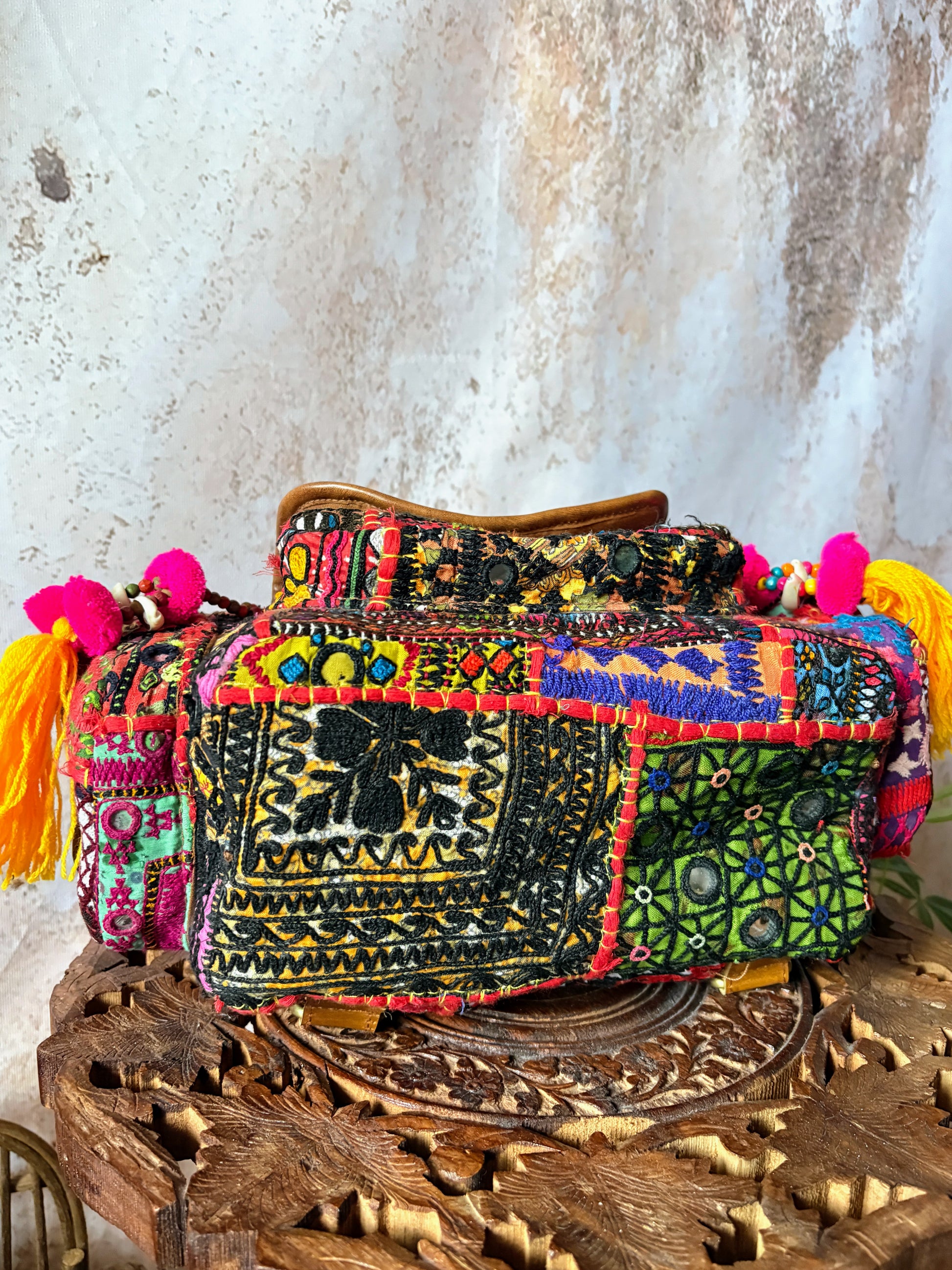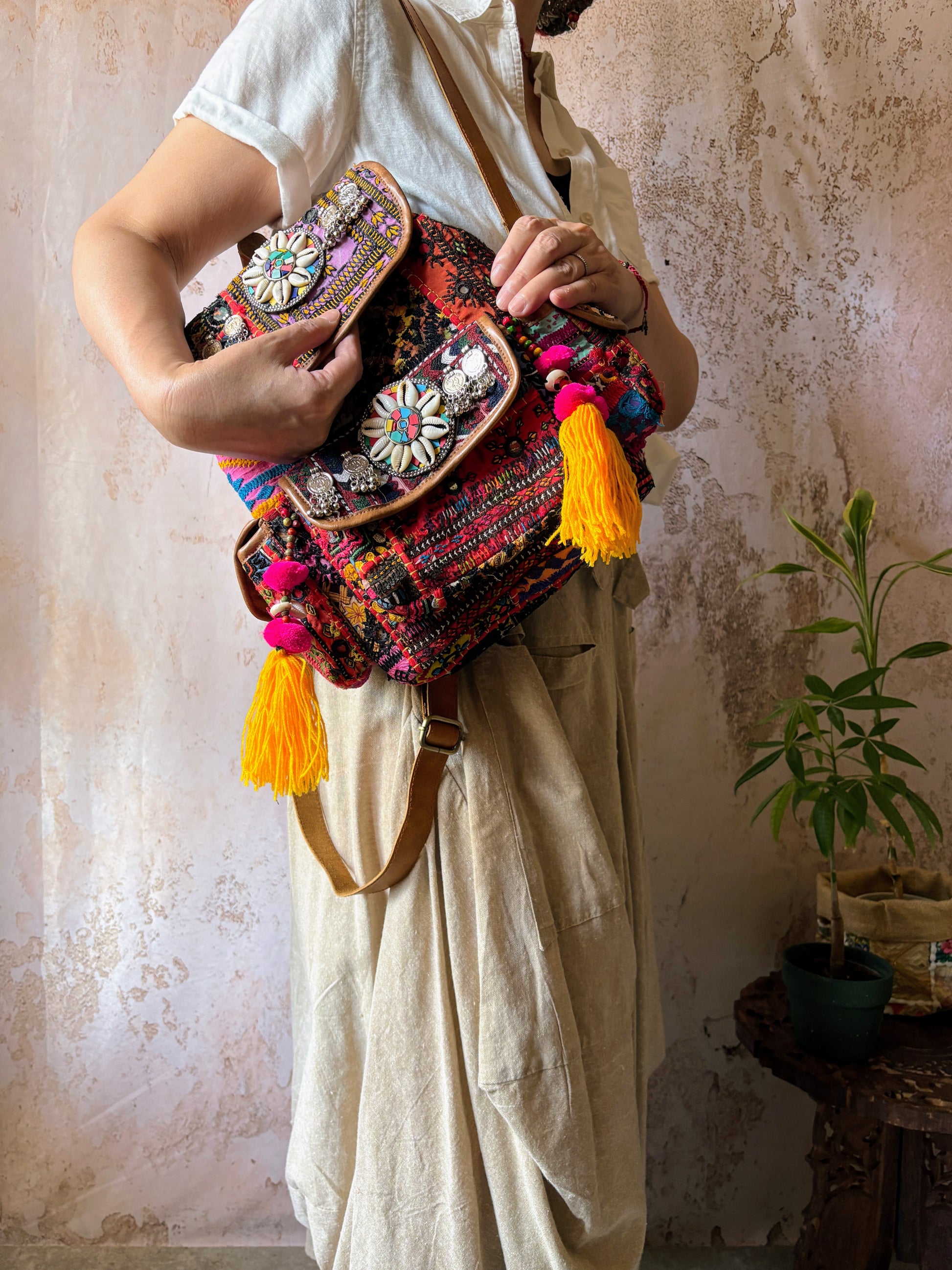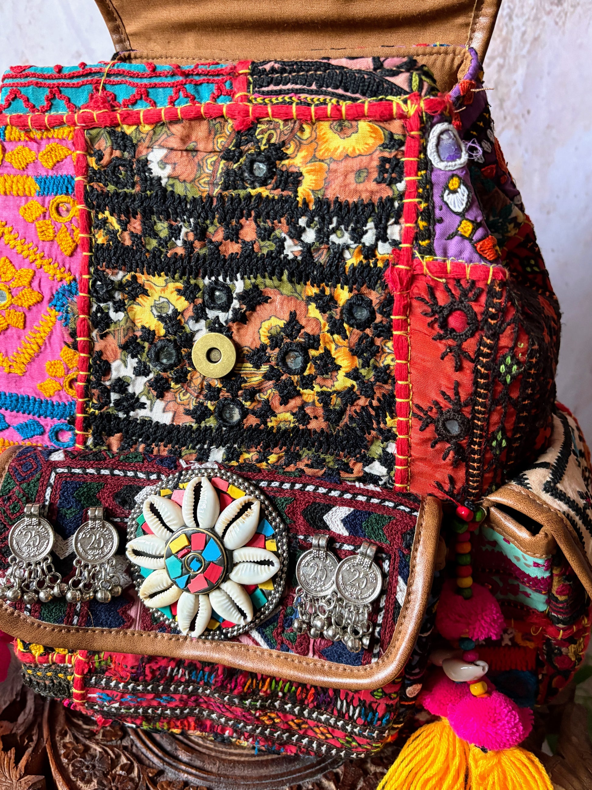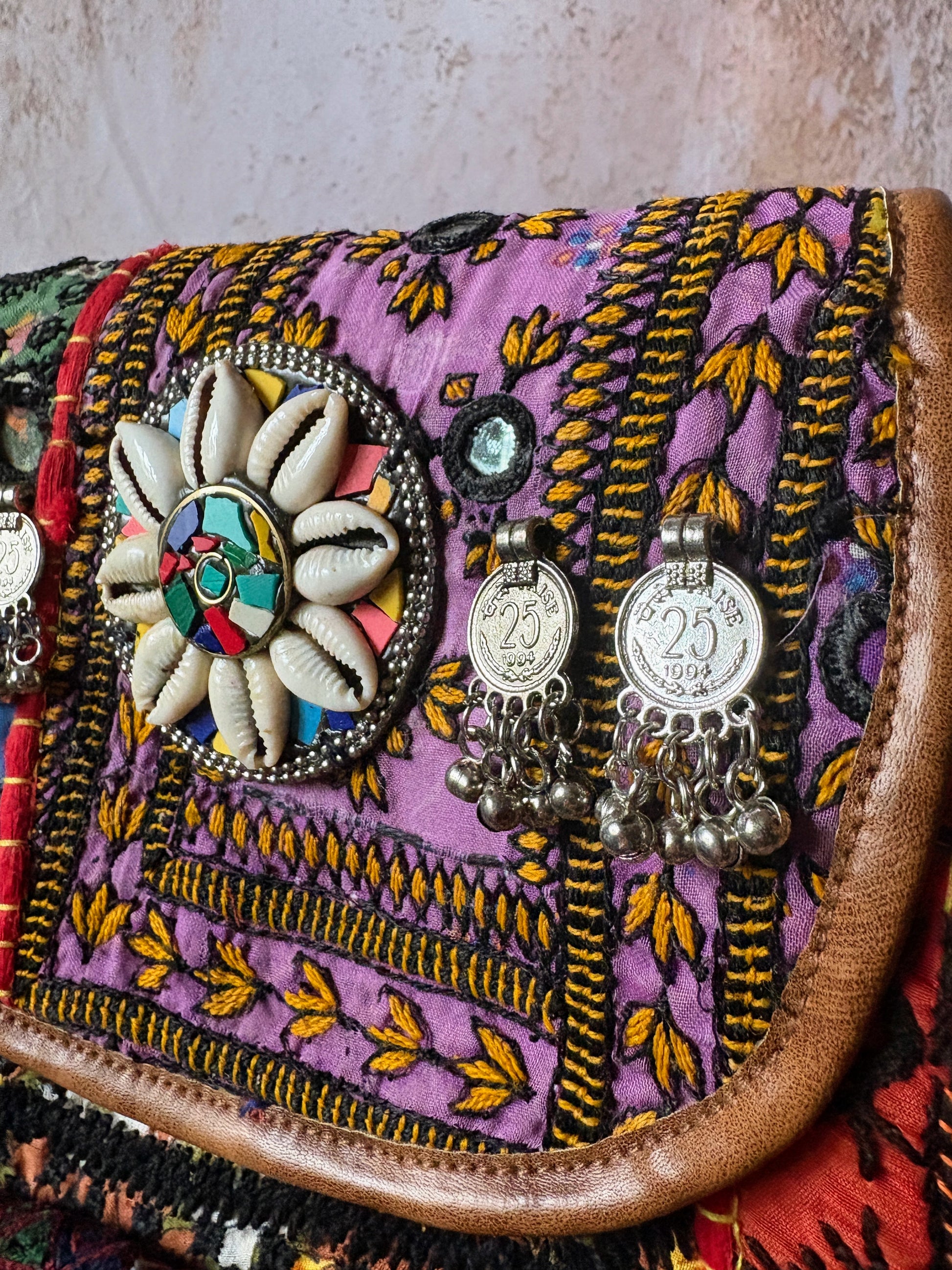 *素材:ヴィンテージコットン、革、ミラー、ポンポン、ビーズ、シェル、コイン