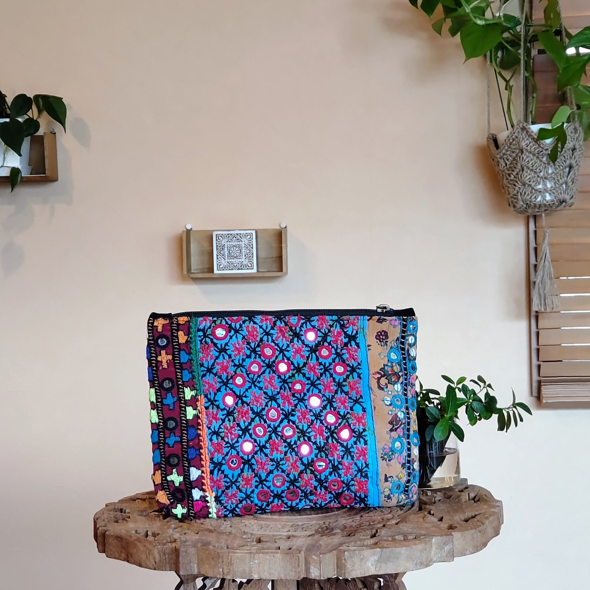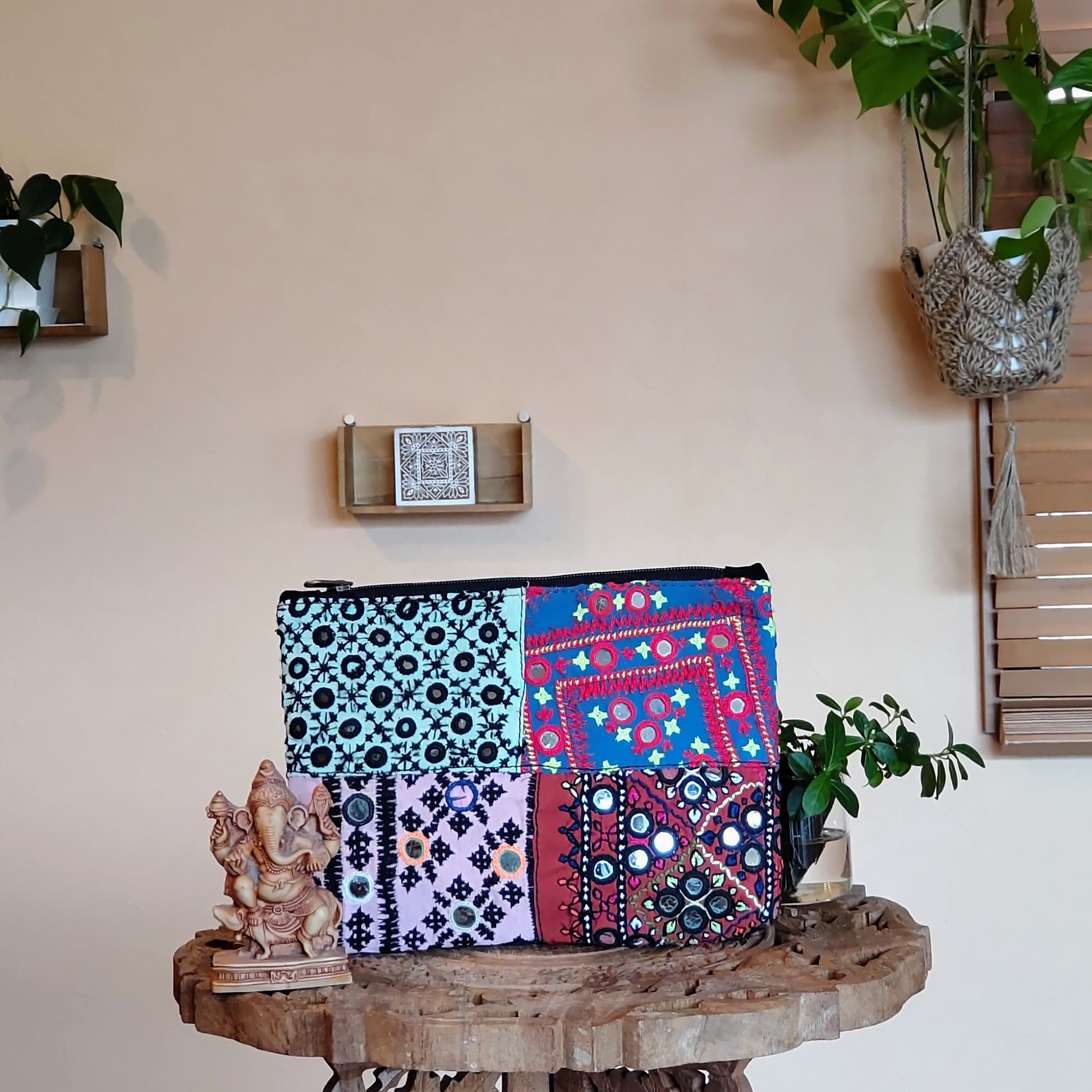 ミラー刺繍のカラフルな布がパッチワークされた可愛いポーチです。