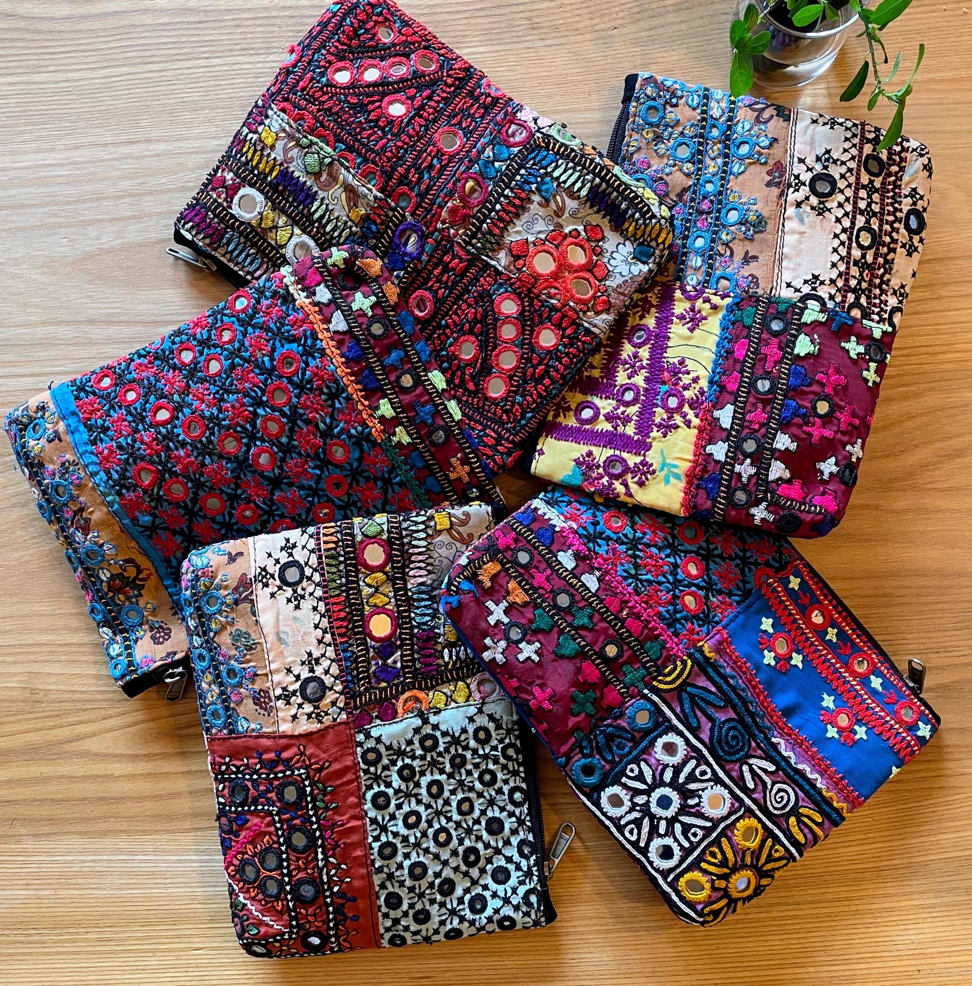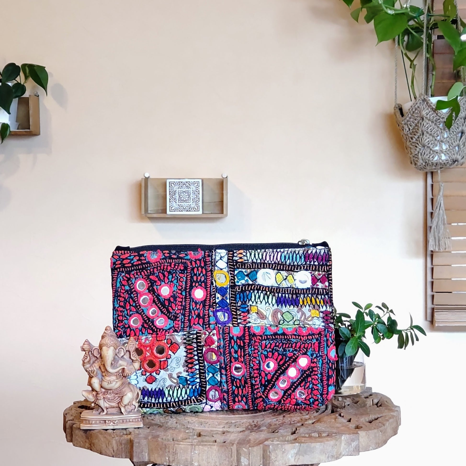 ミラー刺繍のカラフルな布がパッチワークされた可愛いポーチです。